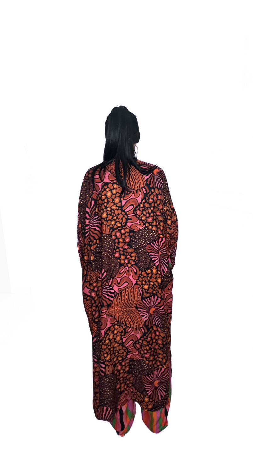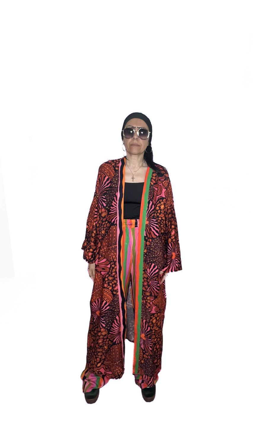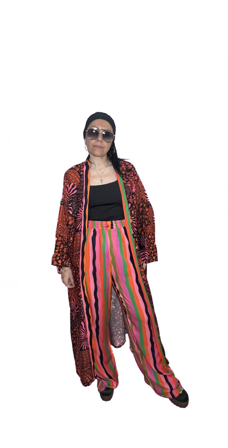 Το μακρύ κιμονό σε μια εκρηκτική παλέτα από πορτοκαλί ,κόκκινο, και ροζ , αγκαλιάζει το σώμα , είναι δροσερό λόγω της βισκόζ , ενώ η ασορτί παντελόνα προσθέτει ύψος και δυναμισμό στην κίνηση σας.