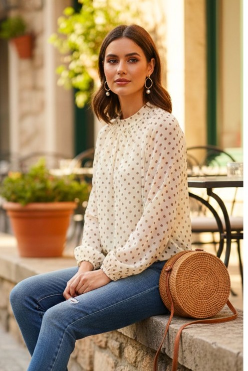 Μπλούζα διαφάνεια πουα στο μπροστινό μέρος έχει επένδυση , πίσω στο λαιμό κλείνει με κουμπί.