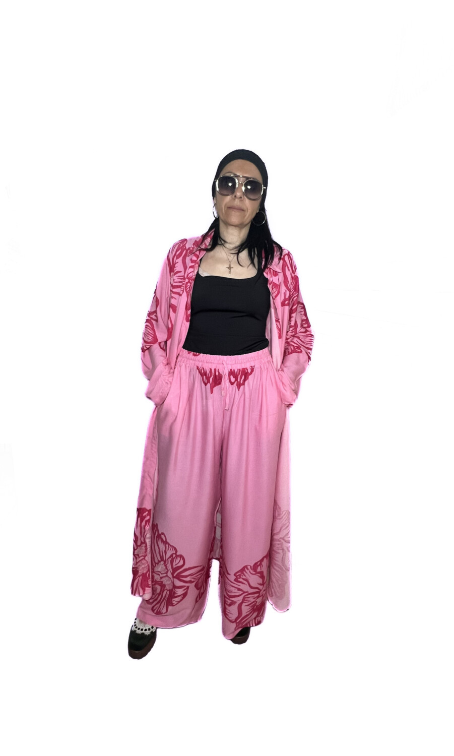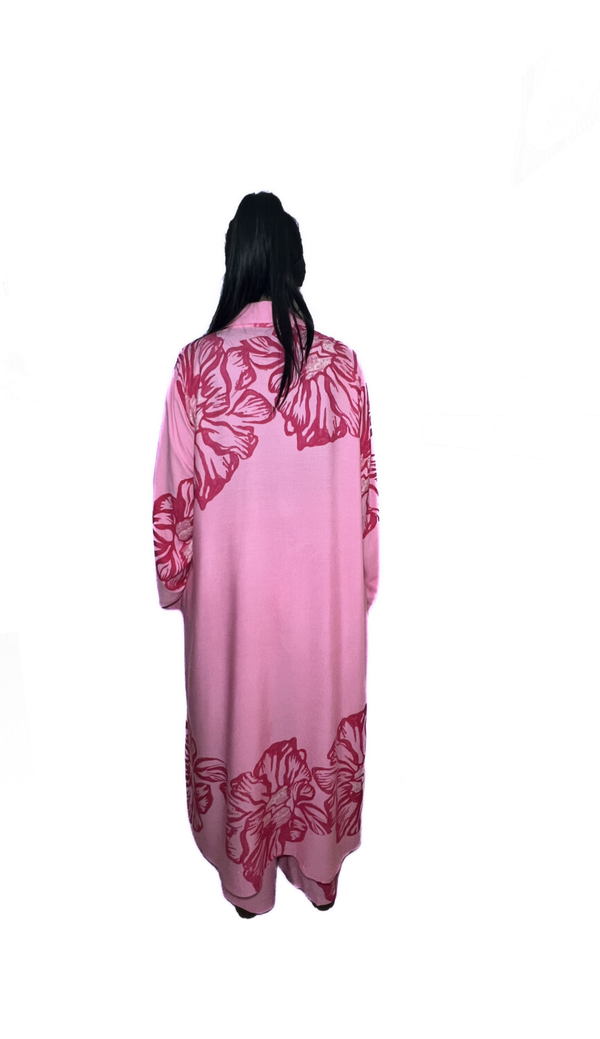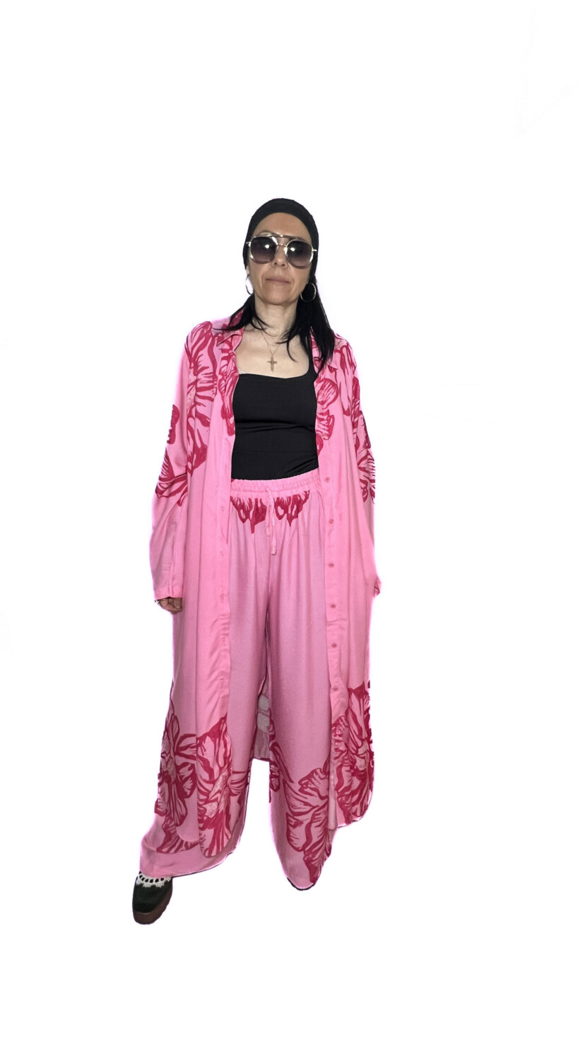 Ανακαλύψτε την πολυτέλεια της άνεσης με το νέο μας σετ από απαλή βισκόζη . Ένα μακρύ κιμονό που αγκαλιάζει το σώμα , συνδυασμένο με μια αέρινη παντελόνα σε παστέλ ροζ τόνους .