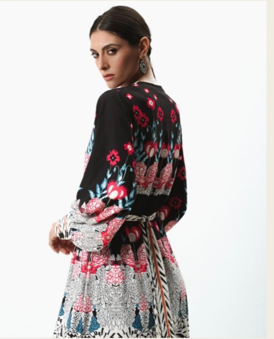 Εκπληκτικό φόρεμα σε crepe satin ποιότητα, με υπέροχες αποχρώσεις. Πατρόν που αγκαλιάζει όμορφα το κορμό, ταιριάζει άψογα σε όλους τους σωματότυπους. Έχει το σωστό μήκος για να μπορεί να φορεθεί με όλα τα ύψη παπουτσιού. Έχει κουμπιά κατά μήκος, όρθιο γιακά και ζώνη υφασμάτινη στο ίδιο print.